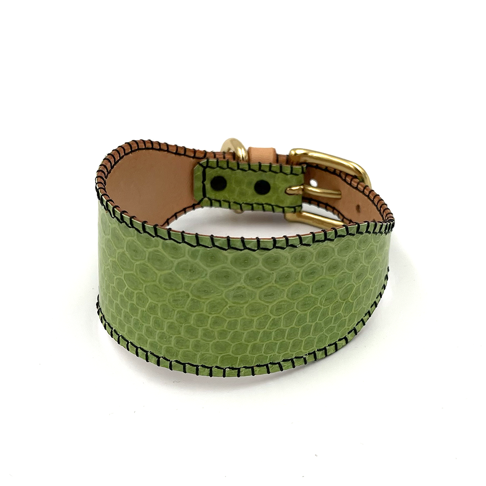 Håndlavet halsbånd i neon-grønt vandslange-skind, der fremhæver myndens elegance. Unikt design med lang holdbarhed og nem vedligeholdelse.